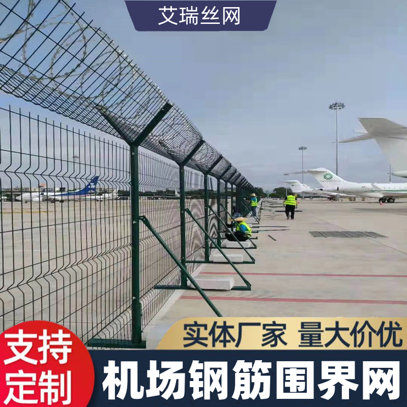 機場飛行區(qū)圍界多由Y型立柱+鋼筋焊接網(wǎng)片+蛇腹式刀刺網(wǎng)組合而成,大多數(shù)時候叫做機場鋼筋網(wǎng)圍界、機場鐵絲網(wǎng)圍界或者機場防護網(wǎng),但是這類防護網(wǎng)不只是應用在機場。由于這種鋼筋網(wǎng)結構有很好的隔離和防攀爬功能,可以應用在很多地方,例如廠區(qū)、園林、軍事、邊防等等。安平縣艾瑞絲網(wǎng)生產(chǎn)的機場圍界網(wǎng),專注于高質量、高全性,隨著市場的不斷更新迭代,我們出品了多款機場鋼筋網(wǎng)圍界,滿足不同地域、不同級別、不同環(huán)境的需求。