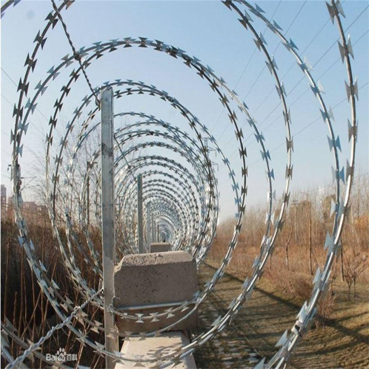 刀型刺絲是一種近年發(fā)展起來的防護、隔離能力較強的新型防護網(wǎng)產(chǎn)品。刀刺網(wǎng)它采用鋼板沖壓成型包附于熱鍍鋅鋼絲(筋絲)之上,由銳利尖角鍍鋅鋼板或不銹鋼薄板做刀片,高張力鋼絲做芯線組合而成的。鋒利的刀型刺由雙線扣裝后成蛇腹狀,既美觀又讓人不寒而栗。起到了很好的阻嚇作用。邊境鐵絲網(wǎng)以刺絲滾籠采用刀片刺繩繞圈后相臨兩圈每隔120°用刺絲連接卡固定,張開后形成蛇腹網(wǎng)狀,閉合后刀片刺繩圈徑為50c,