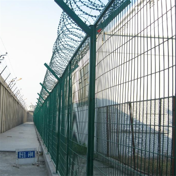 監獄鋼網墻又稱作“Y型安全防御護網”,是由V型支架立柱,加強型焊接片網,安全防盜連接件和熱鍍鋅刀片刺籠組成強度和安全防御性級別很高。近年來,被廣泛應用在監獄,軍事基地等高安全場所。在監獄鋼網墻頂部加裝刀片剌絲、刀片剌繩后又很好的增強了安全防護性能。采用電鍍、熱鍍、噴塑、浸塑等防腐形式,具有很好的抗老化抗曬、耐候等特點。產品造型美觀、花色多樣,既起到圍欄作用,又起到美化作用。