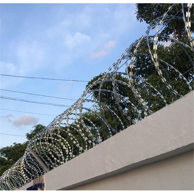 它是用不同材質(zhì)的鋼板與不同材質(zhì)的絲兩種原材料組合而成,先把所需材質(zhì)的鋼板沖壓出刀片的尖刀直條,在和所需材質(zhì)的絲包裹在一起,在制作出我們所需要的圈直徑即可,刀異常的鋒利,只要觸摸到就會(huì)被刺傷,不可能讓非法分子有攀爬翻越的機(jī)會(huì),是現(xiàn)代社會(huì)各場所圍墻安裝的最佳防護(hù)隔離網(wǎng)。